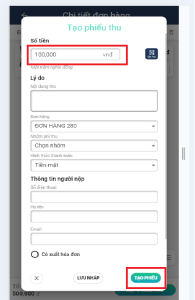 Khi nhân viên thu tiền nhấn nút lập phiếu thu trên mobile, họ sẽ nhập số tiền tạm ứng vào trường số tiền, sau đó nhấn nút tạo phiếu để hoàn tất giao dịch. Trạng thái của đơn hàng là đã tạm ứng cộng với số tiền đã được tạm ứng trước đó.